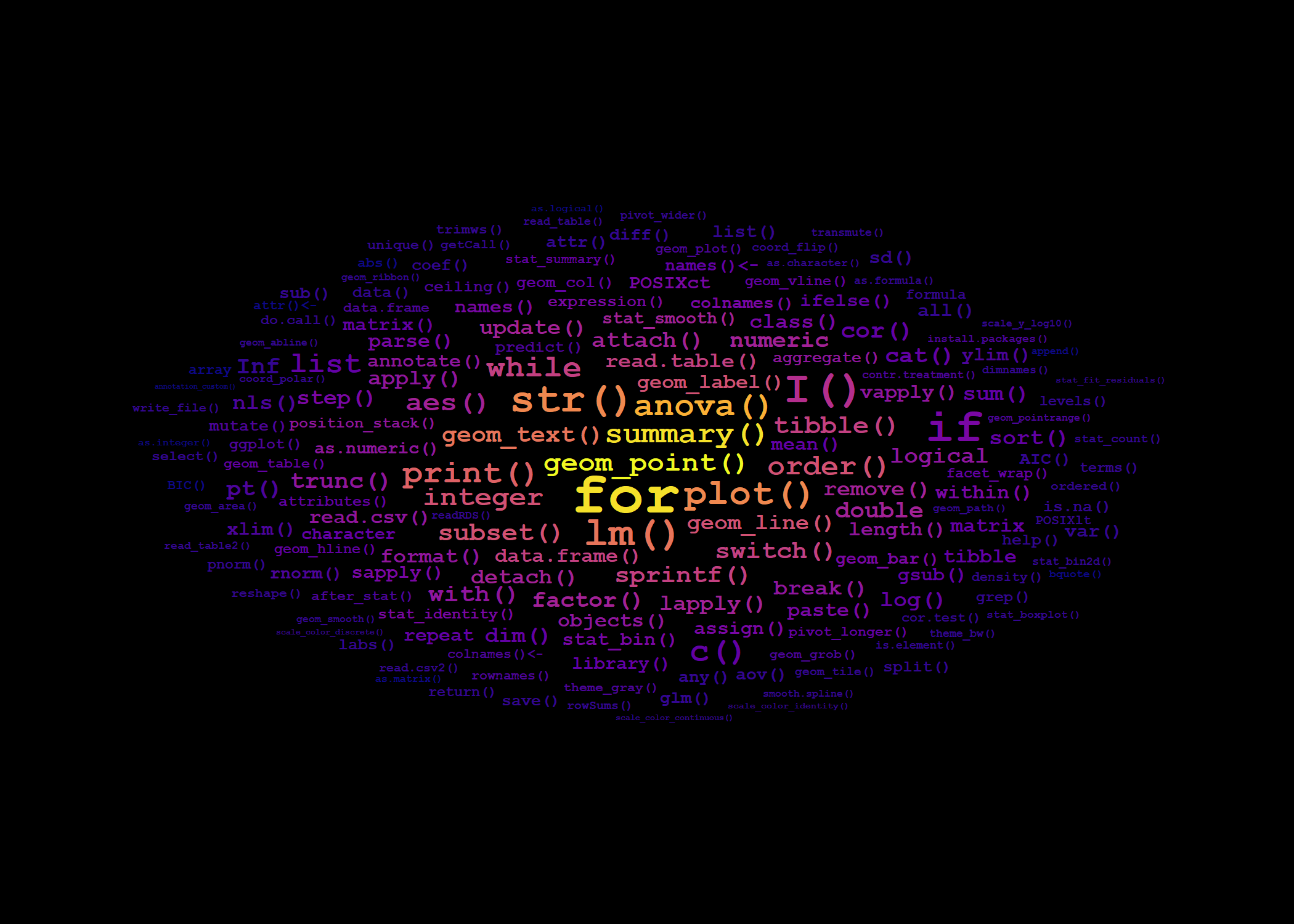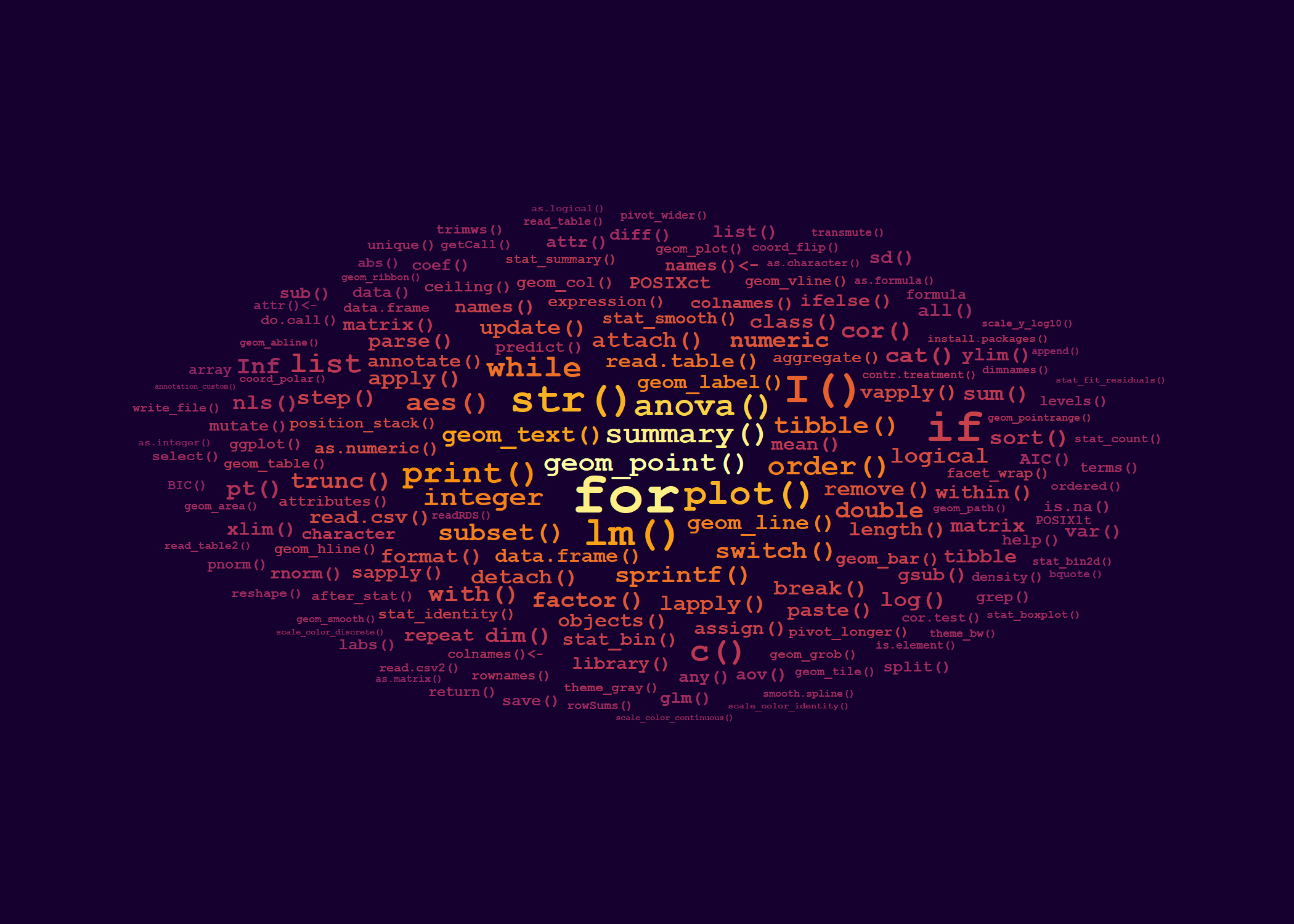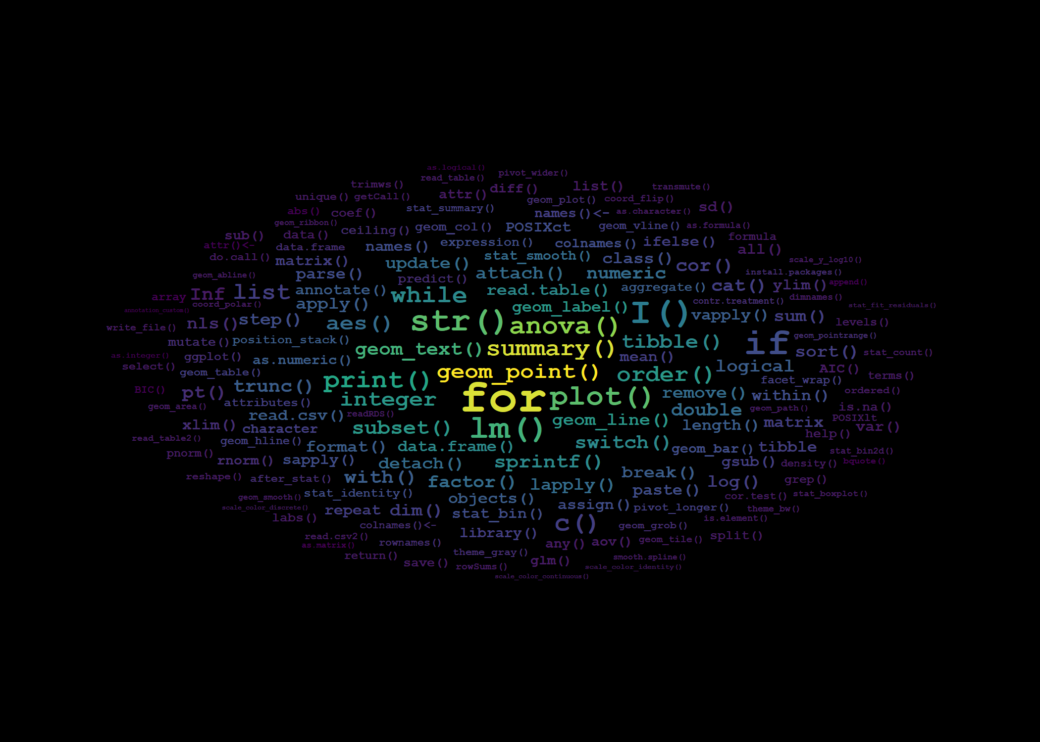 The word cloud that appears on the cover of the book is based on the frequency, or number of times, with which each R function or command appears in the index included at the back of the book. The wordcloud is a ggplot where frequency is mapped to both colour and size aesthetics and the text of the index entries is mapped to the label aesthetic. The positioning is automatically done by geom_text_wordcloud(). I used one of the Viridis colour scales.